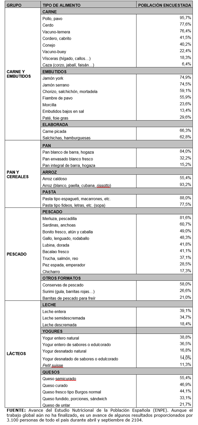 Sobre estas líneas podéis ver la tabla que muestra os alimentos que se contemplan en cada grupo de alimentos y el porcentaje de consumo por parte de la población encuestada. Podemos pensar que en los resultados se ve reflejada tanto la crisis económica como el interés que muestra parte de la población por consumir alimentos más saludables, por ejemplo en el caso de las carnes, el pollo y el pavo encabezan la lista, además de ser productos económicos son carnes bajas en grasas. Lo mismo sucede con los embutidos, el jamón york es saludable y económico, y el jamón serrano es mejor que otros embutidos, sobre el precio hay para todos los bolsillos.