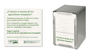 Por ello, en la presente campaña COAG ha apostado por un soporte promocional novedoso y económico, servilletas, que se distribuirán de forma gratuita entre los bares, hostales y restaurantes de aquellos municipios más agrarios. "Vamos a ir a buscar a nuestro público objetivo. A meternos en su rutina diaria, en sus conversaciones cotidianas. Pero sin ser invasivos. De forma original, creativa e impactante. Los bares del pueblo son espacios de ocio en el que el agricultor se encuentra relajado. Queremos conectar el seguro agrario con esa sensación", ha explicado García.
