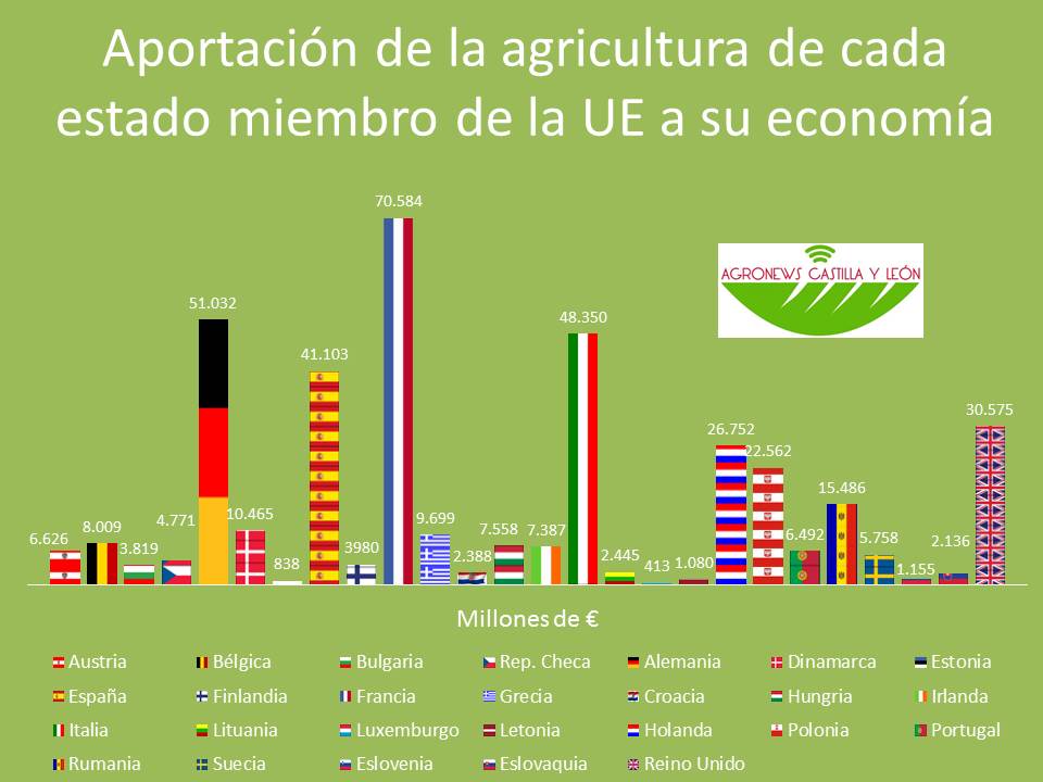 Las producciones agrícolas son predominantes en Rumanía, el 73% de lo que aporta la economía a la economía agraria del país, en Grecia con el 69%, Bulgaria, el 65% y Croacia, 62%, mientras que la ganadería es particularmente significativa en Irlanda aglutinando el 70% de la producción agraria, Dinamarca con el 63% y Finlandia donde representan el 60%.