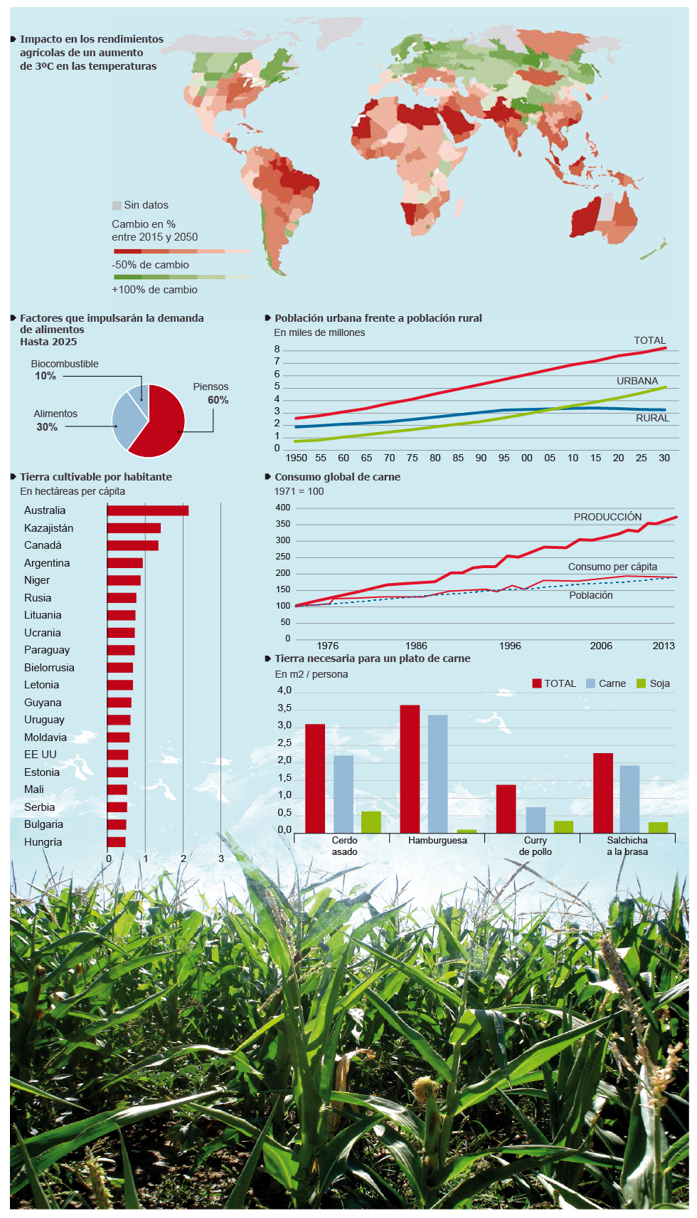 ¿Y cuáles son los retos? Para empezar, tierra y agua. Solo un 11% de la superficie terrestre del mundo es cultivable, pero eso es más que suficiente para alimentar a toda la Humanidad. De hecho, un estudio patrocinado por la Fundación Rockefeller da por superado el peak farmland: el punto en el que más tierra ha sido necesaria para dar de comer al mundo. La desaceleración del crecimiento de la población y la mejora de la productividad harán reducirse esta cifra. Pero el problema es que este último dato solo es cierto si los hábitos de consumo se mantienen como ahora. Y no es así. Según la FAO, hasta 2050 la tierra cultivable deberá crecer un 70% para abastecer a todo el mundo. En 1961, había 2,5 hectáreas de tierra cultivable por habitante y en 2050 habrá menos de 0,8. Al mismo tiempo, se necesita un incremento de 64.000 millones de metros cúbicos de agua dulce cada año para adecuar la producción agroalimentaria a la demanda.