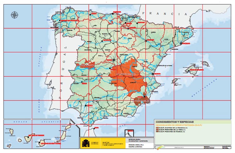 En el caso de condimentos y especias únicamente existen tres DOP reconocidas según el mapa oficial del Ministerio de Agricultura, Alimentación y Medio Ambiente: el Azafrán de La Mancha, el Pimentón de La Vera y el Pimentón de Murcia.