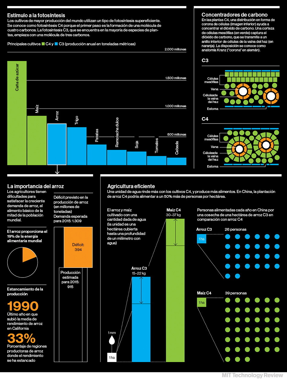 El proceso de supercarga, llamado fotosíntesis C4, impulsa el crecimiento de las plantas mediante la captura de dióxido de carbono y su concentración en células especializadas en las hojas. Eso permite que el proceso de fotosíntesis funcione de forma mucho más eficiente. Es el motivo por el que el maíz y la caña de azúcar crecen de forma tan productiva. Si el arroz C4 llega a funcionar, superará en altura al arroz convencional en sólo unas pocas semanas desde la siembra. Los investigadores calculan que implantar la fotosíntesis C4 en el arroz y el trigo podría aumentar los rendimientos por hectárea en aproximadamente un 50%. Además, sería posible usar mucha menos agua y fertilizantes para producir la misma cantidad de alimento.