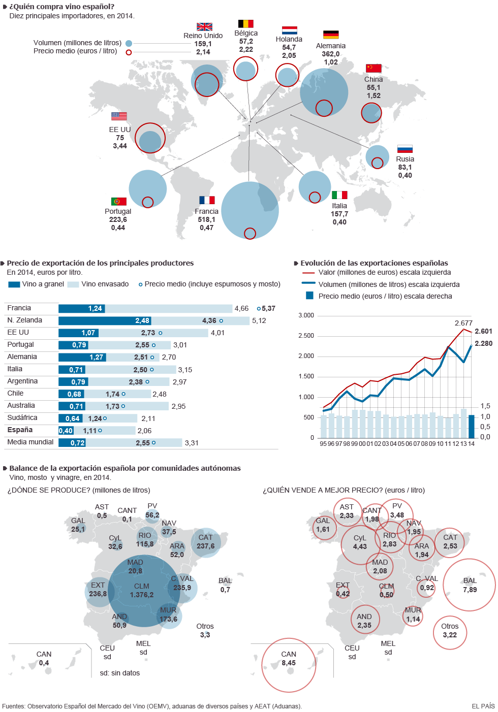 El año pasado se exportó un 22,3% más de vino que el anterior —convirtiendo a España en el mayor exportador del mundo—, pero se ingresó un 3,2% menos y el precio medio por litro cayó un 20,6%, según los datos del Observatorio Español del Mercado del Vino (Oemv). España exportó en 2014 a 1,11 euros el litro frente a los 5,37 de Francia.